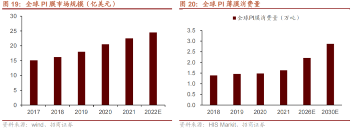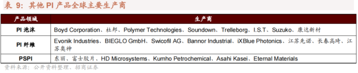 其他PI产品应用大多局限于军事领域,尚未形成大规模商业化应用。聚酰亚胺纤维目前售价较高,目前主要以其独特的低温适用性(胜任外太空-100℃以下温度环境)用于航空航天领域。目前实现大规模生产的厂商只有目前德国Evonik(P84纤维)和我国长春高琦(轶纶纤维)。PI泡沫目前最为重要的应用为舰艇用隔热降噪材料,美国海军已把 PI 泡沫用作所有水面舰艇和潜艇的隔热隔声材料,INSPEC 公司生产的SOLIMIDE 泡沫已被超过 15 个国家制定用于海军船舶的隔热隔声体系,但其暂未大规模进入民用领域。