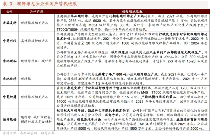 龙头企业正逐步打破国外技术垄断。经过长期的技术积累,我国以吉林化纤、中复神鹰、宝旌、新创碳谷、恒神股份、光威复材等为代表的国内碳纤维龙头企业正逐步打破国外技术垄断,产能规模不断扩张,部分企业产品性能与国际龙头比肩。