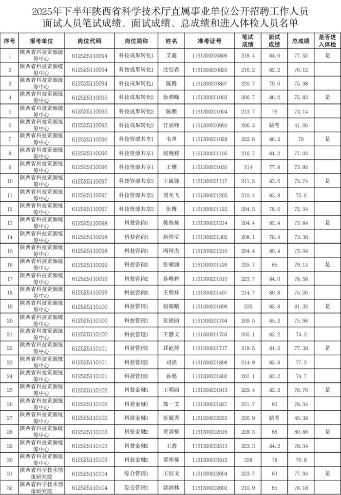按照《2025年下半年陕西省省属事业单位公开招聘工作人员公告》及工作安排,现将参加面试人员的笔试成绩、面试成绩、考试总成绩和进入体检人员名单及体检安排公告如下:
